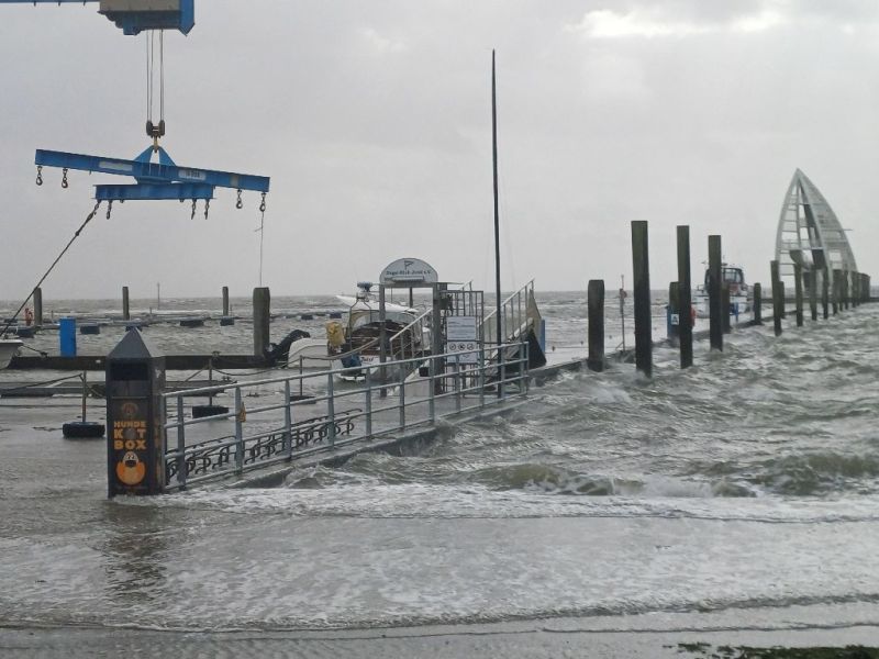 Über die Schräge der Küstenschützer liefen die Wellen zur Hochwasserzeit bis zu den Fahrrädern, die dort abgestellt waren. Auch leidet bei den hohen Wasserständen der Zugangssteg zur Schwimmsteganlage vom Segelklub Juist. Man hofft, dass die Scharniere alles schadlos überstanden haben. Einige Bootseigner haben ihre Boote vorher auf die Nordseite des Steges verlegt, der von West nach Ost im Bootshafen liegt, da lagen die Schiffe sehr ruhig und geschützt.