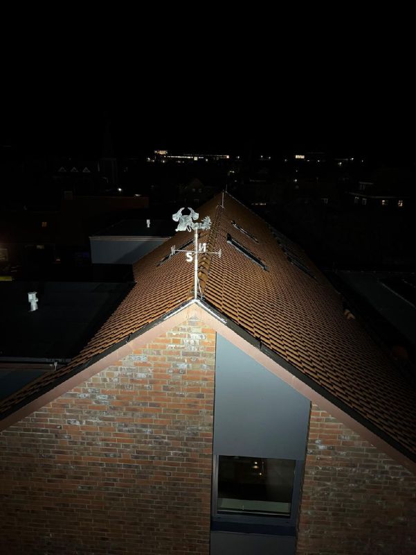 Unter der Führung von Oberfeuerwehrmann Johann Weers bauten die Kameraden David Schuler und Menno Kannegieter ein Gestell, welches von Focko Kannegieter geschweißt wurde auf die Giebelspitze. Somit schmückt dieses tolle, besondere Geschenk nun den höchsten Punkt des Gebäudes.