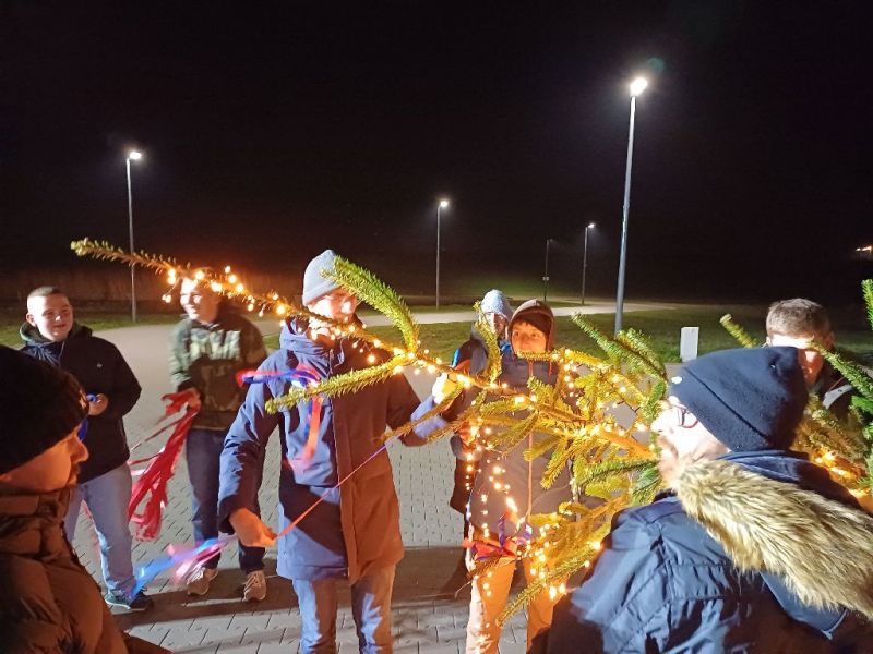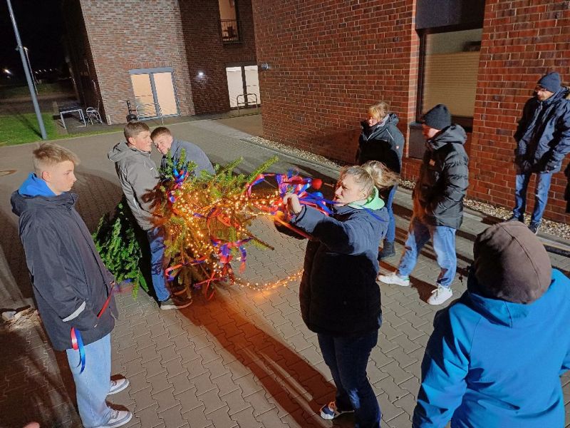 Kaum war dieser aufgebaut, gab es gleich Pläne, dort auch einen Maibaum im Frühjahr aufzustellen. Aber erst einmal galt es, den Weihnachtsbaum mit Lichterketten zu versehen, ebenso kamen rote und blaue Bänder an die Zweige. Hier wirkte auch der später hinzu gekommene Gemeindebrandmeister Arend Janssen-Visser mit, allerdings wurde dazu festgestellt, dass diese Tätigkeit nur bedingt zu seinen Stärken gehört.