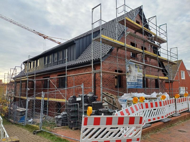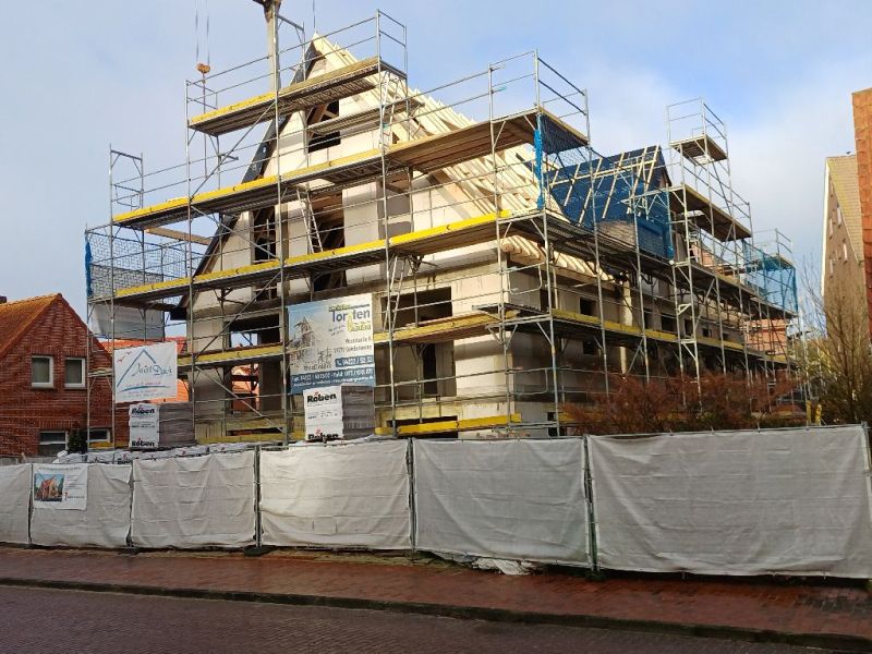 Foto 10: Auch der in der vergangenen Bausaison begonnene Umbau und Sanierung mit energetischen Maßnahmen für das Haus „Frerichs“ in der Gräfin-Theda-Straße 13 wurden in diesem Winter fortsetzt. Hier verhält es sich ähnlich wie in der Friesenstraße, da auch hier kein Bauschein ausgehängt ist, weiß man auch hier nicht, wer als Bauherr verantwortlich zeichnet. (UPDATE: Ein aufmerksamer Leser hat sich daran erinnert, dass im letzten August dort noch das erforderliche Bauschild ausgehängt war und hatte dieses sogar fotografiert. Danke für die Zusendung. Bauherr ist demzufolge eine Firma Schlemm Family Office GmbH & Co. KG in Bremen, als Bauvorhaben wird der Umbau und die Erweiterung eines Wohn- und Pesonalhauses zu einem Wohnhaus mit 14 Wohneinheiten genannt.)