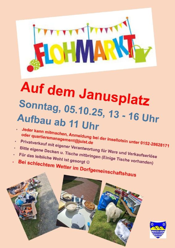 Am Sonntag, den 05. Oktober, findet noch einmal ein Flohmarkt auf dem Janusplatz (bei schlechtem Wetter im Dorfgemeinschaftshaus) statt. Weitere Infos dazu finden Sie auf dem hier eingestellten Plakat.