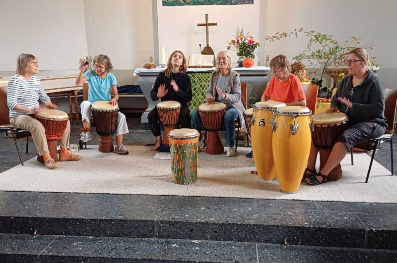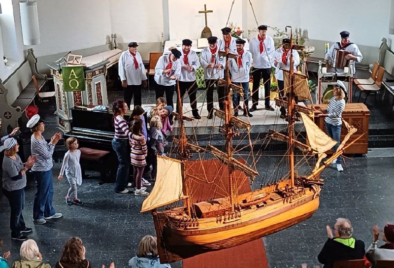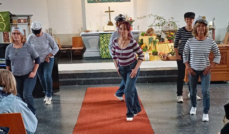 Schnell waren die ersten Sitzreihen abgebaut, damit die Trachtengruppe Platz zum Tanzen hatte. Begonnen hatten die Trommler „Just drums“, die waren gut zu hören und die Kirche füllte sich schnell mit Zuhörern. Als nächsten folgten der Juister Shanty-Chor mit einigen Liedern und die Line-Dancer „Crows in Line“.