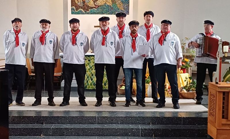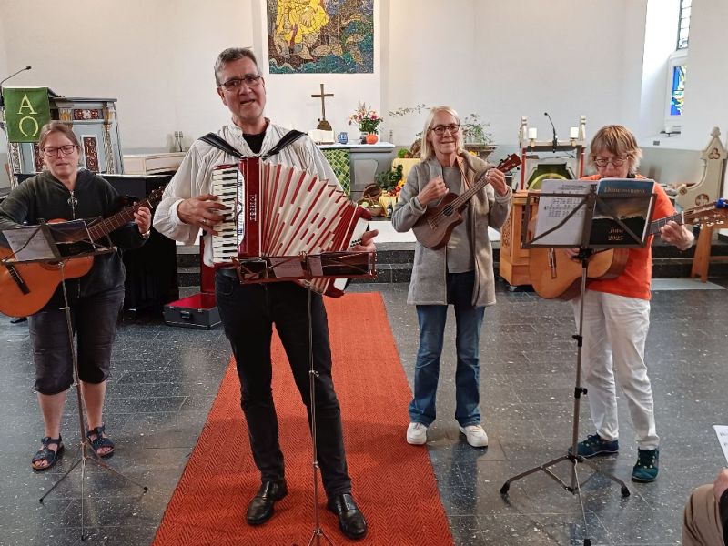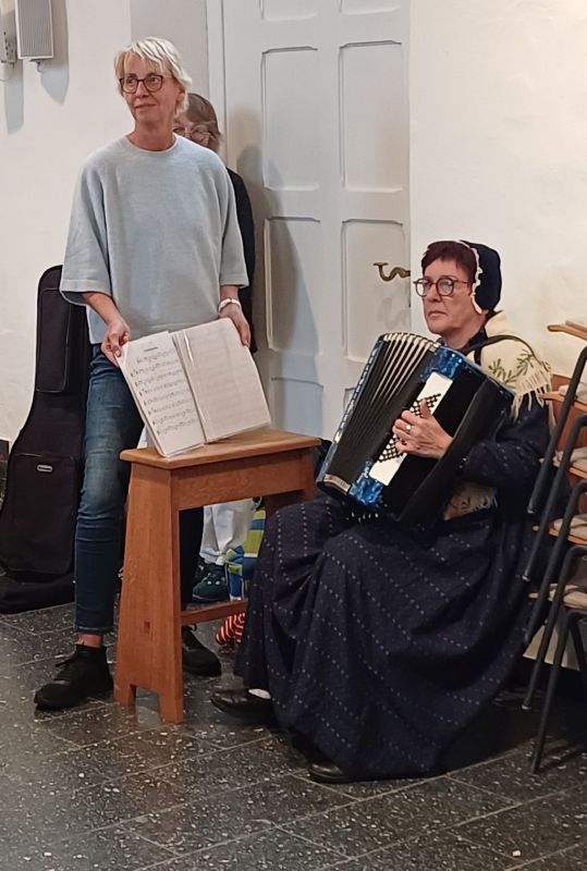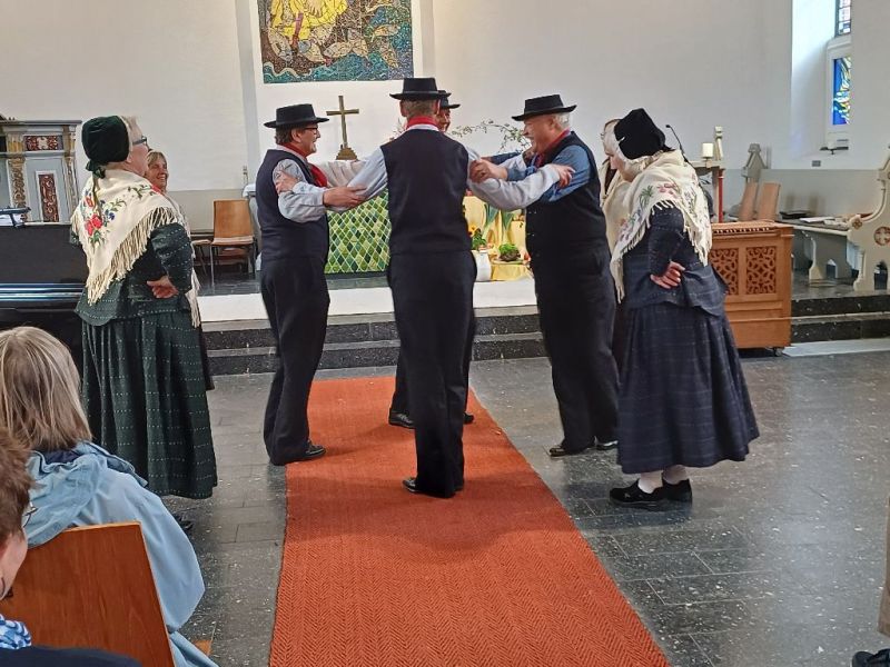Nach einer kurzen Pause füllte sich die Kirche dann zum offenen Singen mit der Dünensing-Band. Und dank der launigen Moderation des Inselkantors Stephan Reiß gab es zahlreiche Lacher obendrein. Neben Kantor Reiß sorgten Elisabeth Tobaben, Gisi Reuter und Heike Westkott mit ihren Instrumenten für den Hintergrund beim Singen. Mit einem Auftritt der Juister Volkstanz- und Trachtengruppe, die mit vier Paaren auftrat, endeten die Aufführungen im der Kirche. „Dreimal an einem Tag war die Kirche rappelvoll – wunderbar. Wann ist das sonst schon so?“, sagt die Inselpastorin.