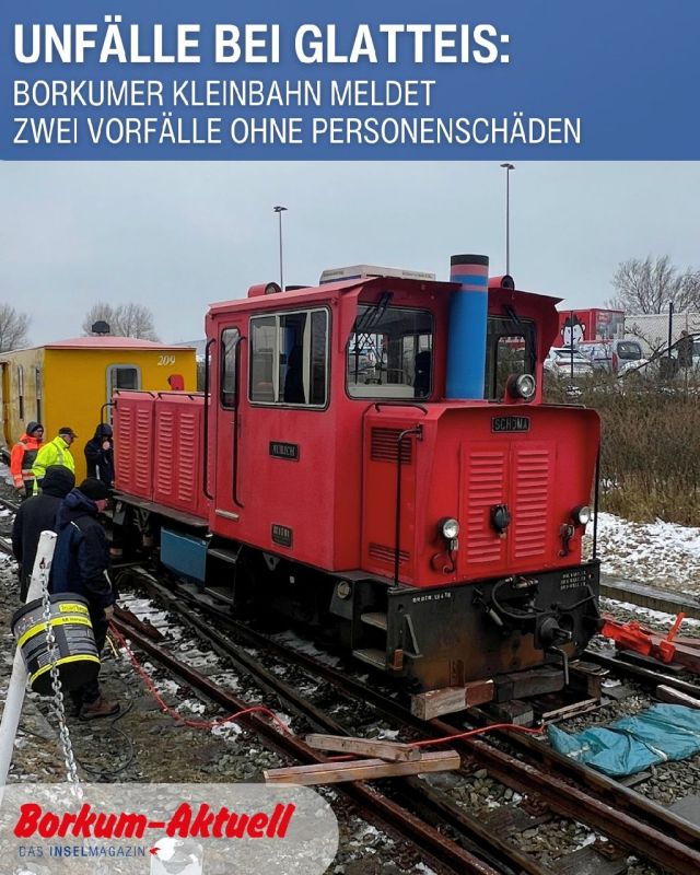 Eine Lok der Borkumer Kleinbahn ist am Donnerstag, den 05. Februar 2026 gegen 11:00 Uhr bei der Ausfahrt vom Hafen in den Ort auf der Höhe einer Weiche bei extremer Witterung und trotz niedriger Geschwindigkeit entgleist. Die wenigen Insassen in den Waggons und der Lokführer blieben unverletzt. Die Waggons selbst sind nicht entgleist.