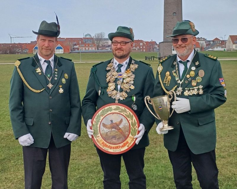 Unser Foto oben auf der Startseite zeigt das neuen Königshaus der Herren: (v.l.n.r.) Adjutant Klaus Petzka, Schützenkönig Jann Fisser, Kronprinz Ulrich Löhmann