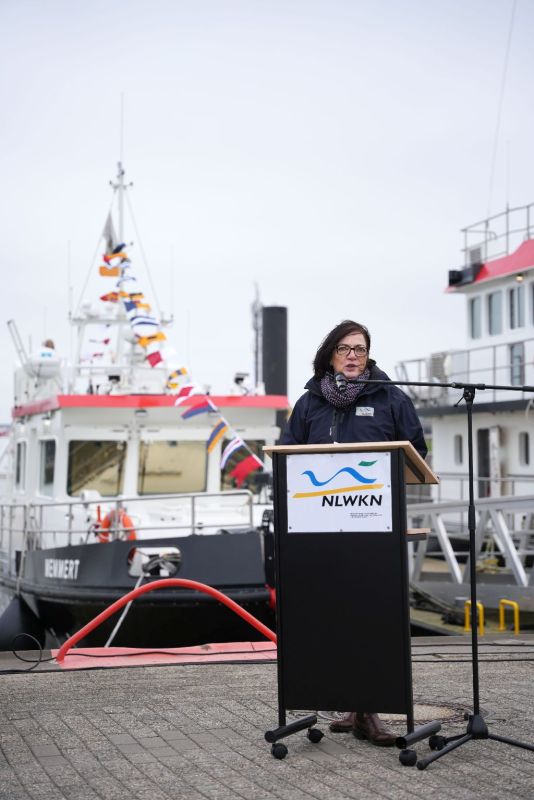 „Dieses Schiff ist für den NLWKN etwas ganz Besonderes“, unterstrich dann auch Anne Rickmeyer bei ihrer Festansprache. Es handele sich weder schiffsbautechnisch noch aufgabentechnisch um einen 1:1-Nachbau eines bereits vorhandenen Schiffs. „Die Anforderungen an Einsatzgebiet und Leistungsspektrum gehen über die seiner Vorgängerbauten weit hinaus“, so die Direktorin des Landesbetriebs. Rickmeyer nutzte den Festakt, um an die Verdienste des langjährigen NLWKN-Aufgabenbereichsleiters Schiffsbetrieb Dirk Oberliesen zu erinnern. Oberliesen, der im vergangenen Sommer nach kurzer schwerer Krankheit verstorben war, hatte während seiner Dienstzeit die Modernisierung der NLWKN-Schiffsflotte für die Aufgaben im Bereich Küstenschutz und Schadstoffunfallbekämpfung wesentlich vorangetrieben. Als Projektingenieur hatte er auch am Bau der „Memmert“ mitgewirkt. „Dass wir heute hier eine feierliche Schiffstaufe begehen dürfen, verdanken wir allen voran auch Dirk Oberliesen“, betonte Anne Rickmeyer.