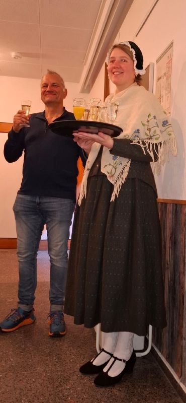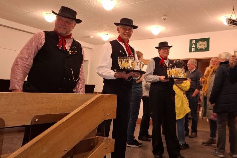 Bereits vor Beginn sorgten die Volkstanz- und Trachtengruppe „Juister Hupfdohlen“ mit einem Sektempfang sowie der Musikzug der Freiwilligen Feuerwehr Juist für einen stimmungsvollen Auftakt. Olaf Hollwedel eröffnete den Abend und sprach mit einem Augenzwinkern von einer Welturaufführung auf Hochdeutsch, nachdem das Stück zuvor ebenfalls erstmalig in Elisabethfehn in plattdeutscher Sprache aufgeführt worden war. Mit den Worten „Viel Vergnügen mit der Theatergruppe Antjemöh und Bühne frei“ übergab er an das Ensemble.