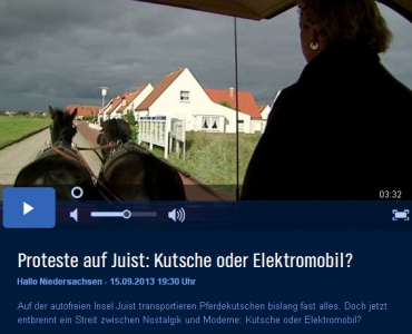 Auf der autofreien Insel Juist transportieren Pferdekutschen bislang fast alles. Doch jetzt entbrennt ein Streit zwischen Nostalgik und Moderne: Kutsche oder Elektromobil? Link zum Video [3]