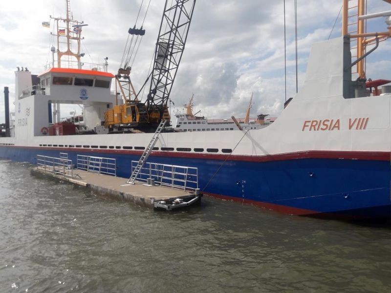 Am Freitagmittag (04. September 2020) wurde mit der Montage des schwimmenden Anlegesteges für die beiden Schiffe des Frisia-Inselexpress im Osthafen des Juister Hafens begonnen. Dazu müssen zwei Pfähle in den Hafen eingerammt werden. Die Arbeiten werden durch den Wasserbaufachbetrieb Gebrüder Neumann aus Emden durchgeführt, als Arbeitsschiff dient dazu das Frachtschiff „Frisia VIII“