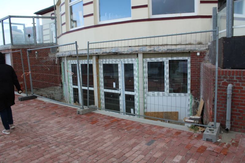 Nun ein Blick auf die Strandpromenade. Die Fotos 2 und 3 wurden an der „Strandhalle“ aufgenommen. Hier wurde die Treppe und der Eingangsbereich zur „Strandmuschel“ erneuert. Innen soll aber wie bisher die beliebte Eisdiele bleiben. Zudem finden Renovierungen statt, unter anderem am Spielplatz und dem Boden der Terrasse.