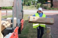 Müllabfuhr auf autolosen Inseln mit Pferd und Wagen ist etwas ganz anderes als mit LKWs auf dem Festland. Abfuhrbeginn ist hier zwar auch wie überall, doch an seinem Tag als Müllwerker musste Jannis um fünf Uhr raus aus den Federn. Es ging ins Loog, wo sich Stall und Weide der vier Pferde befinden, die dem Landkreis gehören und die wechselweise eingesetzt werden. Füttern, tränken, pflegen (Jannis: „Ich habe Gustav gestriegelt“) und anspannen, erst dann geht geht es auf den Bock und los. Punkt acht Uhr wuchten am Anfang der Dellertstraße Andreas Pläsier und Cipzian Cotuno die ersten schweren Reststofftonnen in die Leervorrichtung am Wagen und ebenfalls von Hand werden sie nach oben geschwenkt und geleert, während Jannis die ersten Kartons – in dieser Woche ist Papier dran, nächste Woche wieder gelbe Säcke - auf den hinteren Wagen stellt, wo Abbo Bröckelmann sie fachmännisch und platzsparend stapelt. Abbo ist das große Vorbild für den jungen Gelsenkirchener, denn der Juister hat immer mit Pferden gearbeitet und gleich nach der Schule angefangen, Pferdegespanne zu fahren. Erst bei Privatunternehmern, und seit der Landkreis die Müllabfuhr auf den Inseln in Eigenregie durchführt, ist er dort angestellt.