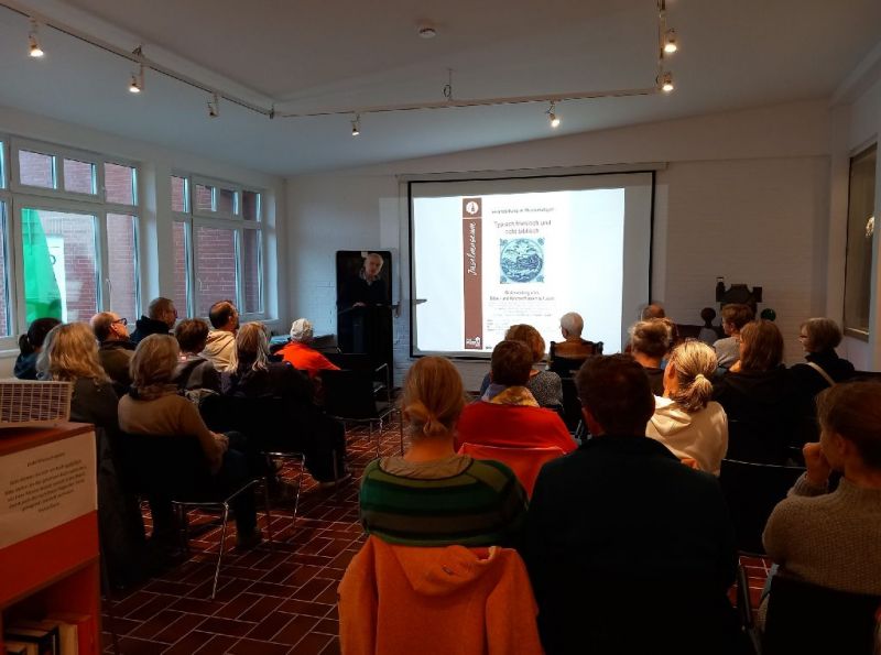 Die zweite Aufnahme zeigt das mit interessierten Besuchern gefüllte Foyer im Inselmuseum während des Vortrages.