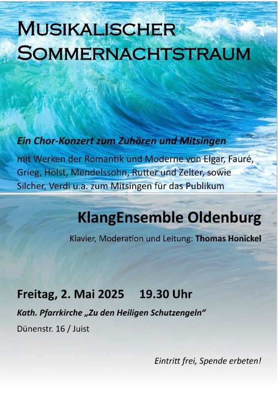 Eine Konzertreise nach Juist wird vom 1.-4. Mai den Chor ElangEnsemble Oldenburg auf die Insel Juist führen, wo es auch zwei Konzerte in der kath. Inselkirche geben wird. . Am 2. Mai gibt der Chor unter der Leitung von Thomas Honickel dort ein weltliches Konzert mit Mitsinganteilen unter dem Titel „Musikalischer Sommernachtstraum“ realisieren. Am Tag darauf 3. Mai gibt es ein sakrales Konzert als musikalische Abendandacht unter dem Titel „Sakrales Kerzenkonzert“.