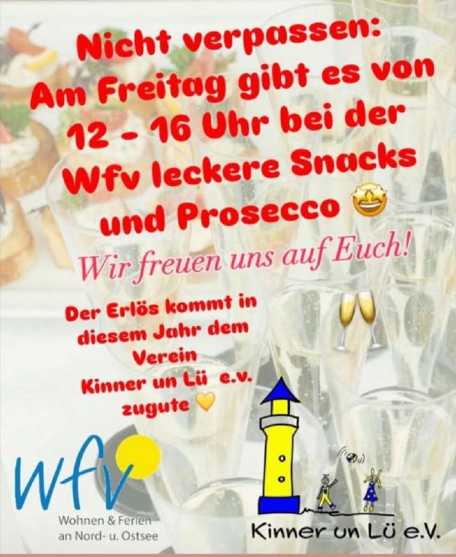 Zu einer besonderes Veranstaltung lädt die WFV Wohnen und Ferien Vermittlungs-GmbH am Freitag (30. Mai) ein: In der Zeit von 12:00 bis 16:00 Uhr werden dort leckere Snacks und Prosecco angeboten. Wie im Vorjahr soll der Erlös aus dieser Aktion wieder einem gemeinnützigen Verein der Insel zugute kommen, diesmal ist es für Kinner un Lü e.V. bestimmt. Die WFV findet man in der Wilhelmstraße 7, gegenüber vom Nordseehotel/Hubertus-Klause.