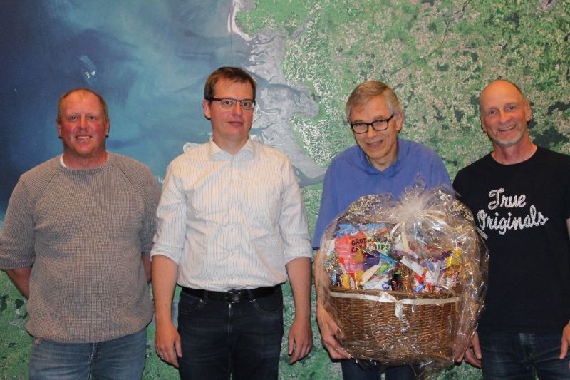 Zu unserem Foto: Schwer zu tragen hatten Meint Habbinga (dritter v.links) am Präsentkorb, den er von den drei Vorstandsmitgliedern (v.l.n.r.) Hauke Janssen-Visser, Gerhard Jacobs, Jens Heyken überreicht bekam.