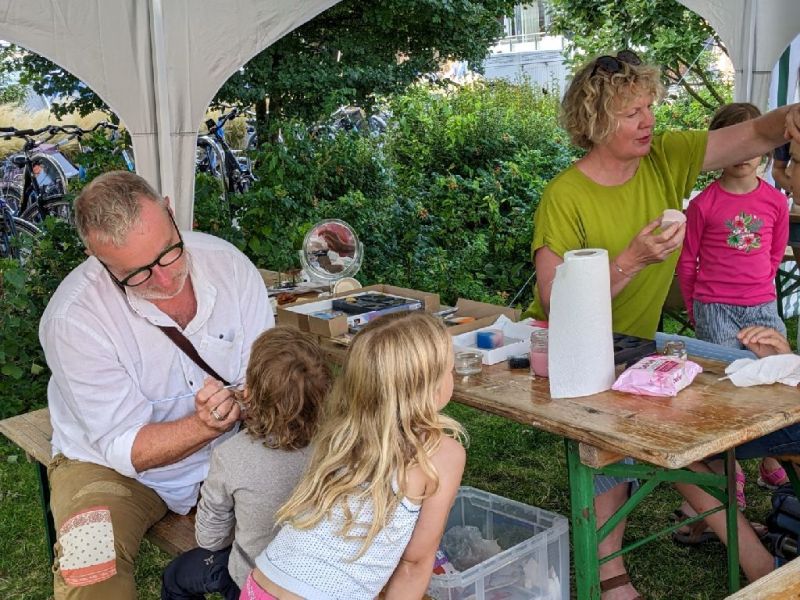 Yanet und ihr Strandsportteam schminkten die Kinder. Unterstützt wurden sie von zwei freiwilligen Helfern, die ihren Urlaubstag opferten, um tatkräftig mit anzupacken. Zwischendurch durfte auf der Hüpfburg getobt oder bei der Mini-Disco getanzt werden. Nachmittags trat das Nick-March Trio auf und sorgte für gute musikalische Unterhaltung. Anschließend spielte Joel lateinamerikanische Musik. Bei diesen Klängen und Rhythmen war Mittanzen angesagt. Yanet und Rudi zeigten das Salsatanzen für jeden erlernbar ist.