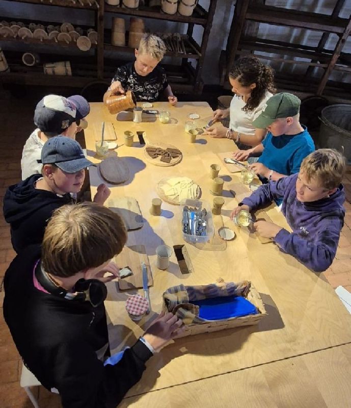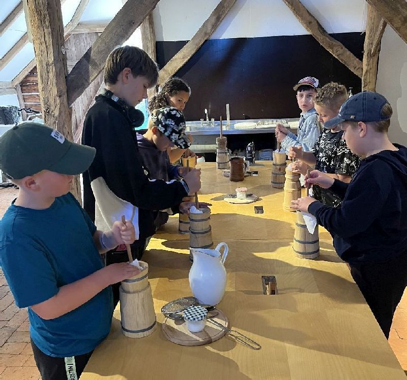 Gleich am nächsten Tag folgte eine Reise in die Vergangenheit: Das Museumsdorf in Cloppenburg konnte den Kindern einen Einblick in den Alltag der Menschen vor ungefähr 200 Jahren geben. Schnell wurde ihnen bewusst, dass sich die Wohnsituation, die Ernährung, die Regeln und auch der schulische Alltag von unserem heutigen Leben stark unterscheiden. Um den Punkt Ernährung greifbarer darzustellen, mussten die Schüler eine besondere Aufgabe bewerkstelligen: Butter aus eigener Kraft herstellen, so wie es vor vielen Jahren noch üblich war. Nach etwa dreißig Minuten konnte die aus Schlagsahne hergestellte Butter bei einem Schwarzbrot und einem Stück Käse genossen werden. Anschließend wurde nach einem kleinen Stadtbummel das nahegelegene Kino ins Visier genommen, wo der Abend eingeläutet wurde.