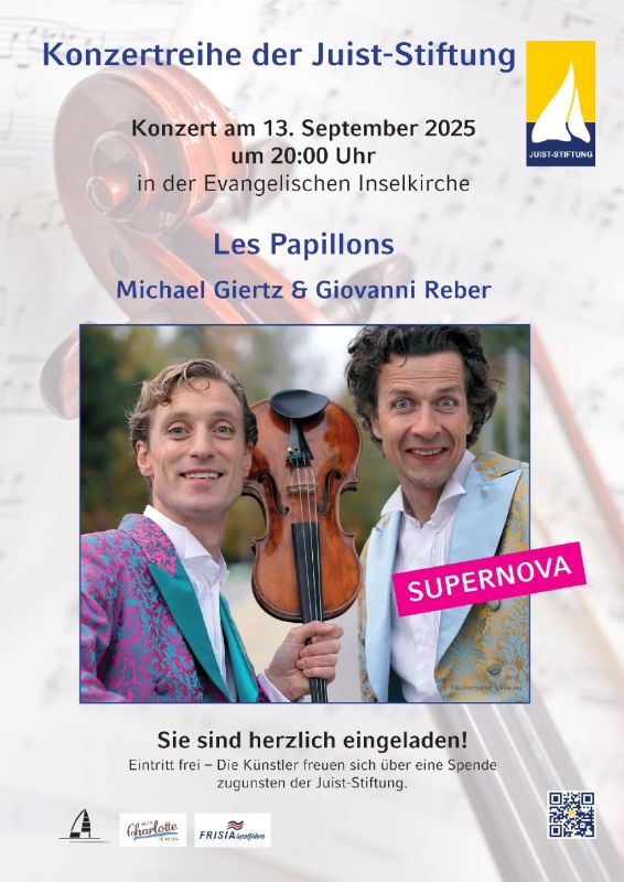 Die Juist-Stiftung lädt wieder zu einem Sommerkonzert in der Evangelischen Inselkirche am Samstag, den 13. September 2025, um 20:00 Uhr ein. Das Duo Les Papillons, bestehend aus Michael Giertz und Giovanni Reber, welches auch schon im Vorjahr dabei war, spielt ihr Programm SuperNova. Der Eintritt ist frei, es wird aber um eine Spende zu Gunsten der Juist-Stiftung gebeten.