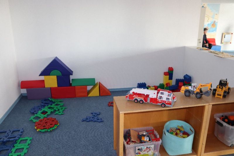 Durch einen Durchbruch wurde der bisherige Spielraum mit dem ehemaligen Leseraum im Erdgeschoss verbunden, wodurch eine größere und hellere Fläche entstanden ist. Neben mehr Platz zum Toben stehen den Kindern nun neue Spielgeräte wie Schaukeln, Motorikschleifen und Balanciermöglichkeiten zur Verfügung. Ergänzt wird das Angebot durch einen Maltisch, eine kleine Leseecke sowie verschiedene Gesellschaftsspiele.