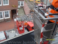 Unter schweren Atemschutz drangen die Feuerwehrleute in das Gebäude zur Menschenrettung ein, inzwischen hatte man aber festgestellt, dass es keinerlei Rauchentwicklung gab und es sich bei den zu rettenden Personen um Mitglieder der Jugendfeuerwehr handelte. Trotzdem wurde die Übung mit der nötigen Disziplin weitergeführt. Die Drehleiter wurde in Stellung gebracht und über einen Balkon die ersten Personen aus dem Gefahrenbereich geborgen.