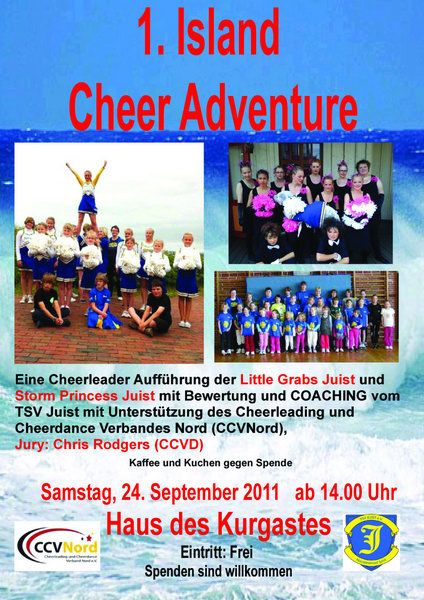 Am Samstag, 24. September 2011 ab 14.00 Uhr findet im Haus des Kurgastes eine Cheerleader Aufführung der Little Grabs Juist und Storm Princess Juist mit Bewertung und COACHING vom TSV Juist mit Unterstützung des Cheerleading und Cheerdance Verbandes Nord (CCVNord) statt. Jury: Chris Rodgers (CCVD). Der Eintritt ist frei - Spenden sind willkommen