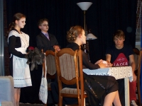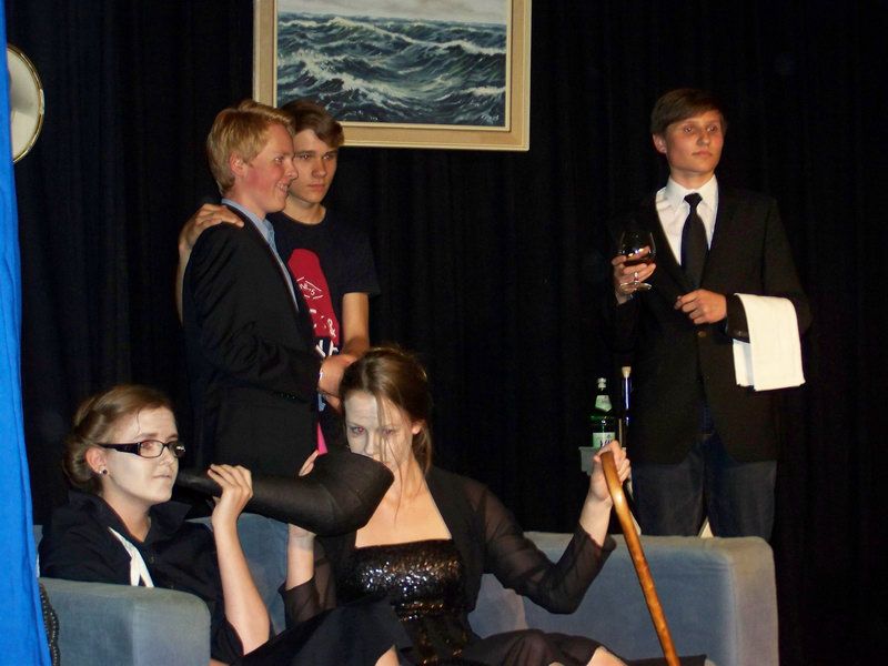 Neun Spielerinnen und Spieler zeigen zuerst das kriminalistische Lustspiel "Mörder mögen?s messerschaft" von Christine Steinwasser. Hierzu hatte man ein gelungenes Bühnenbild, ein Wohnzimmer im Anwesen eines Barons, erstellt. Baron Ansgar von Herrschershausen (Tamo Vielhaber) wurde dort ermordet, und als Geist weiterlebend bekommt er mit, dass er von seiner geldgierigen Ehefrau Lukretia (Jeenke Ahrends) und deren Liebhaber, dem Verwalter Dietmar Knör (Jona Endelmann) hinterrücks erstochen und in den See geworfen wurde. Um eine falsche Spur zu legen, wird auch Hausmädchen Sophia (Lea Danzer) ermordet, auch sie erscheint als Geist wieder. Um Aufklärung der Verbrechen bemüht ist Butler Johann (Johann Weers), der hierzu seine Cousine Else Nehrlich (Marina Uhle), die als Kommissarin bei der Polizei tätig ist, ins Haus holt. Ihr zur Seite steht Assistent Hugo Geist (Henrik Poppinga). Ebenso sind die tüdelingen Tanten des Barons, Restituta (Charlotte Großhans) und Honoria (Inse Bockelmann) an einer Aufklärung interessiert, da ihnen durch die Baronin der Rauswurf aus dem Schloss droht. Gemeinsam gelingt es den Lebenden und den Toten, die Bösen zur Strecke zu bringen. Alle Spieler/innen konnten in ihren Rollen überzeugen und zeigten sich zudem sehr textsicher. Viel Freude machte Jeenke Ahrends, die neben ihrer Rolle als Baronin auch als Telefon-Stimme wirkte ("Bitte drücken sie die Zwei...., ich habe sie nicht verstanden") und die Kommissarin zur Verzweifelung bringt. Die tragende Rolle hatte Johann Weers als Butler Johann, er lieferte ein Meisterstück ab. Ob er die Speisefolge des Vorabends wiederholte, mit vielen Fachausdrücken die Vorzügen einzelner Weinsorten erläuterte, oder auch voll des guten Weinbrandes weiterhin versucht, auf Gentlemen zu machen, das Publikum hatte sichtlich Freude.