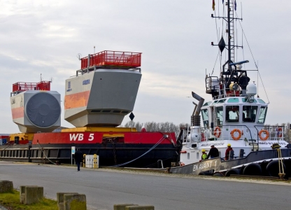 Heute (Mittwoch, 23. November) Morgen in Bremerhaven: Frisch eingetroffen zwei Windmühlen-Gondeln aus dem Offshore-Windpark GT1, 93 km nordwestlich der Insel Juist gelegen. Vom Basishafen Eemshaven aus wird die Hubinsel THOR für Wartungsarbeiten eingesetzt.