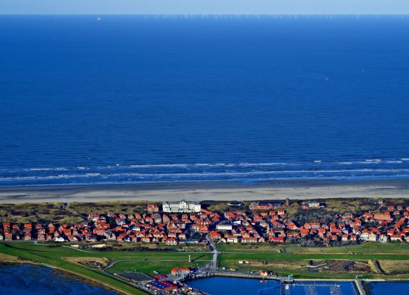 Von der Strandpromenade aus kann man die Windparks in der Nordsee liegen sehen. Am vergangenen Montag entstand bei hervorragenden Sichtverhältnissen dieses Foto, welches die Insel Juist und hinten am Horizont die Windparks Godewind I und II zeigt.
