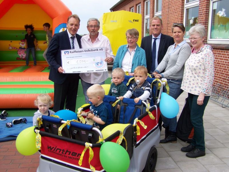 Mit der Verlegung des Hauses in Ortsnähe endete die lange Tradition des Kindergartenbusses. Hier wurden die Kinder bereits während der Fahrt betreut. Aus Ausgleich wurden im neuen Haus die Öffnungszeiten entsprechend erweitert, so Zingel. Er überbrachte ebenfalls Grußworte des früheren Inselpastors Kurt Perrey, dem die Belange vom "Schalbennest" während seiner langen Amtszeit auf Juist immer sehr am Herzen lagen. Zugleich übergab er eine Spende in Höhe von 1.500 Euro für die Einrichtung und einen Kinderwagen mit sechs Sitzen für die jüngsten Kinder.