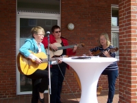 Am Kindergarten angekommen gab es dann den zweiten Teil des Gottesdienstes, als Begleitinstrumente wirkten nun die Gitarren von Inselpastorin Elisabeth Tobaben sowie Gabriele Hahn und Petra Sülwald. Tobaben segnete schließlich das neue Haus, danach konnte Hausleiter Torsten Gesch die Anwesenden begrüßen: "Wir sind stolz und froh, heute so eine würdige Einweihung durch diesen Gottesdienst erleben zu können." Gesch dankte besonders der großen Zahl von Sponsoren, die Preise für eine Tombola gestiftet hatten.