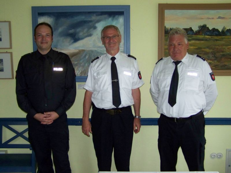 Unser Foto auf der Startseite zeigt (v.l.n.r.) Ingo Brickwedde, Leiter vom Polizeikommissariat Norden, der neue Juister Polizeibeamte Günther Herrmann, Bürgermeister Dietmar Patron, Polizeiinspektionsleiter Hans-Jürgen Bremer (Aurich), der scheidende "Dorfsherrif" Detlef Eichmann und Detlev Löwe vom Kriminalermittlungsdienst Norden. Ein weiteres Bild zeigt Polizeichef Hans-Jürgen Bremer (mitte) mit dem neuen Juister Polizisten Günther Herrmann (links) und dem scheidenden Detlef Eichmann (rechts). Ein drittes Foto zeigt die neue Juister Familie mit Günther Herrmann, Partnerin Sandra, vorne Sohn Jan und im Kinderwagen der kleine Elias.
