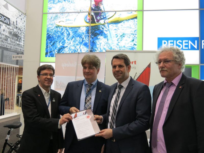 Im Rahmen einer offiziellen Preisverleihung auf der Internationalen Tourismusbörse (ITB) in Berlin ist Juist von der gemeinnützigen Beratungs- und Zertifizierungsorganisation TourCert als „Nachhaltiges Reiseziel“ ausgezeichnet worden. Olaf Lies, Niedersächsischer Minister für Wirtschaft, Arbeit und Verkehr, und Dr. Peter Zimmer, Geschäftsführer TourCert, übergaben das Zertifikat an Juists Bürgermeister Dr. Tjark Goerges und Nachhaltigkeitsbeauftragten Thomas Vodde.
