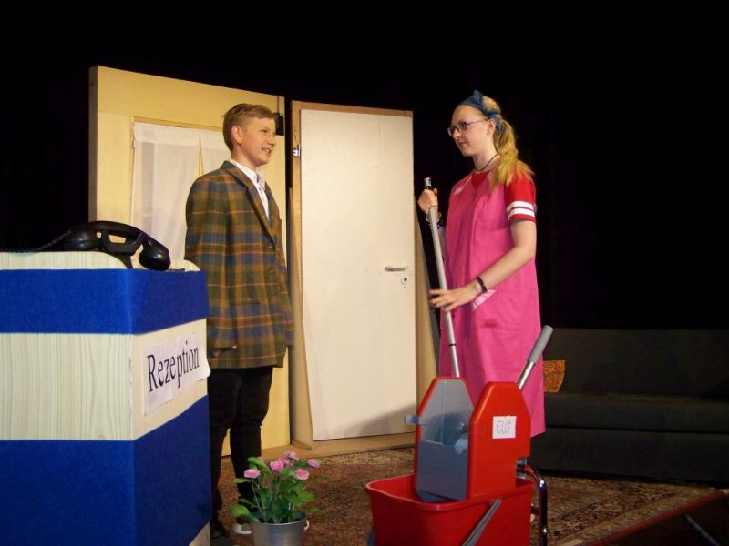 Dreizehn Schülerinnen und Schüler konnten sich diesmal für das Theaterspiel begeistern, gemeinsam mit Gerrit Schlauwitz, der sich trotz seiner vielfältigen Aufgaben als Schulleiter immer die Zeit nimmt, die Gruppe zu leiten, wurde ein Stück eingeprobt. Nachdem es in den Vorjahren oft Sketsche oder kleine Einakter gab, wagte man sich diesmal an einen abendfüllenden Dreiakter. Ausgesucht hatte man das Stück „Grand malheur“ von Bernd Gombold. Der aus Baden-Württemberg stammende Autor machte übrigens auch seine ersten Theatererfahrungen in der Grundschule, später wurde das Theaterspiel zu seinem Hobby, bis er auch anfing, Stücke zu schreiben.