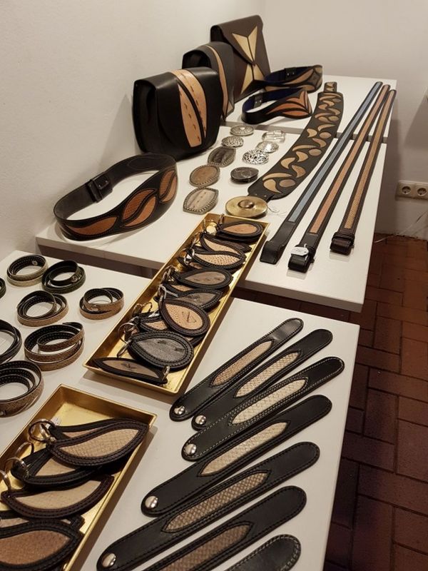 Abgesehen davon sind die handgenähten Taschen, Gürtel, Wandbilder und vieles mehr auch einfach nur schön. Kristof Mascher hat eine Intarsientechnik entwickelt, mit der er aus einer Kombination von Rinds- und Fischleder Ornamente entstehen lässt, in der die spezielle Struktur und Färbung dieses besonderen Materials zur Geltung kommt.
