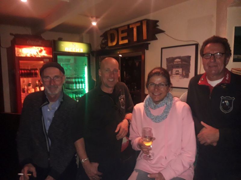 Unser Foto zeigt (v.l.n.r.) den Borkumer Bühnenbauer Uwe Behrmann, den Juister Regisseur Olaf Hollwedel, Namensgeberin Alice Behrmann und Mitspieler und Autor Stefan Erdmann beim anschließenden gemütlichen Beisammensein in der „Spelunke“