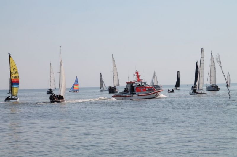 Zahlreiche SKJ-Mitglieder waren ebenfalls mit ihren Motorbooten an der Regattastrecke als Sicherungs- oder Wendemarkenboote. Zudem war das Juister Rettungsboot „Hans Dittmer“ der DGzRS vor Ort. Gesegelt wurden drei Durchgänge eines Dreieckkurses auf dem Nordland. Bei angenehmen drei bis vier Windstärken kam es aber zu keinen bedrohlichen Situationen. Lediglich eine Jolle kippte nach dem Zieleinlauf um, der Eigner verzichtete aber auf Hilfe und konnte sein Schiff auch selbst wieder aufrichten und in den Hafen einlaufen.