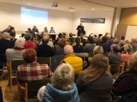 Unsere weiteren Fotos zeigen den vollbesetzten Zuhörerbereich im Dorfgemeinschaftshaus, ein weiteres Bild zeigt den Berater Horst Bötcher bei seinen Ausführungen, im Hintergrund als Zuhörerin SPD-Ratsfrau Martina Poppinga, die die Durchführung der Bürgerversammlung beantragt hatte.