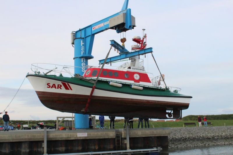 Am 12. Oktober war es dann soweit, der neue Wagen war auf der Insel und das Museumsschiff konnte endgültig aus seinem Element geholt werden. Da der SKJ-Kran für bis zu 16 Tonnen Tragkraft zugelassen ist, konnte es damit an Land gehoben werden. Nachdem das Unterwasserschiff gereinigt war, kam es auf den Wagen und stand noch ein paar Tage auf dem Schotterplatz westlich vom Stationsgebäude der DGzRS.