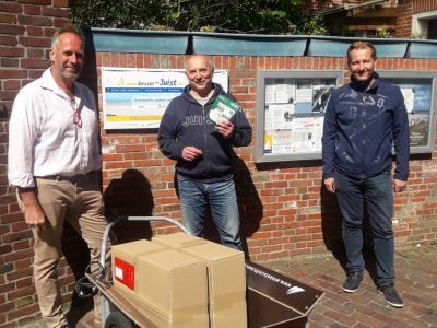 Zudem war bei der Übergabe Andreas Venhoff dabei, der als Objektplaner und kreativer Kopf bei edataunited tätig ist und zuletzt auf Juist die Sanierung und den Umbau vom bisherigen Haus „Ebeling“ zum „Winkelschiffchen II“ leitete. Sein Vorschlag war, ein Maskenset zur Begrüßung an alle Gäste zu geben. Die Verpackungen mit „Willkommen auf Juist“ könne man in der firmeneigenen Druckerei kurzfristig herstellen.