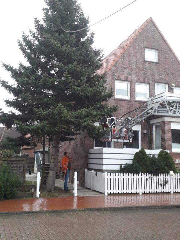 Es wurde dann eine gemeinsame Aktion, denn für die Freiwillige Feuerwehr war die Entfernung des Baumes eine gute Übung, falls solche Dinge mal in Notfällen durchgeführt werden müssen. Die Besatzung der Drehleiter und Feuerwehrmänner mit einer Ausbildung für die Kettensäge schafften es, den Baum ohne Schäden zu fällen und auf einen Anhänger einer hiesigen Spedition zu verladen.