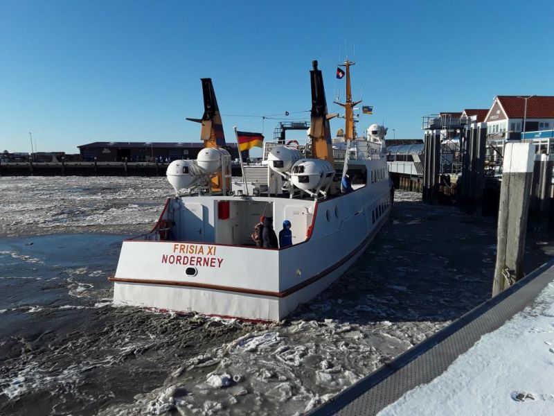 Langsam sammelt sich immer mehr Eis in den kalten Nächten im Juister Hafen und Hafenzufahrt an. Dieses lässt sich derzeit aber noch gut durchfahren und der Fähr- und Frachtverkehr findet planmäßig statt. Wie es sich in den nächsten Tagen weiter entwickelt, muss man abwarten. Zur Insel Wangerooge fährt seit Montag bereits kein Schiff mehr.