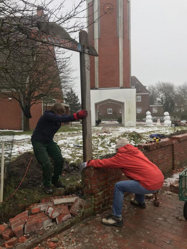 Daran beteiligt waren Inselpastorin Stefanie Lohmann, ihre Vorgängerin Elisabeth Tobaben, Julia Reiß, Anke Nottmeyer und Natalia Piatek. „Das Ganze war in knapp zwei Tagen erledigt, allerdings meckern meine Knochen; feinmotorische Tätigkeiten wie Tee in Teepott löffeln muss ich vertagen“, so Anke Nottmeyer nach der Aktion. Unzählige aufmunternde Sprüche wie „Tja, das habt ihr jetzt von der Emanzipation“ oder „Kann leider nicht helfen, muss arbeiten“ haben beim Schaufeln und Reißen geholfen. Beim Beladen der größeren Mauerbrocken in den Container hatte dann aber doch noch Kantor Stephan Reiß mitgeholfen.