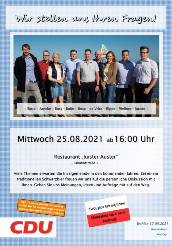 Am Mittwoch, den 25. August 2021, stehen die Kandidaten der CDU den Bürgern Rede und Antwort beim Meinungsaustausch im/vor dem Restaurant Juister Auster. Die Veranstaltung beginnt um 16:00 Uhr. (Siehe Infoplakat) Selbstverständlich können alle Kandidaten auch gerne außerhalb des Termins jederzeit angesprochen werden.
