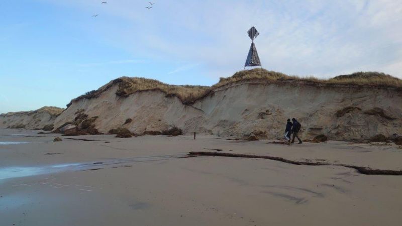 Da man in den letzten vier Jahren im Bereich der Bake keine Sandfangzäune gesetzt hat, ist es kein Wunder, wenn die Bake in diesem oder kommenden Winter fällt. Natürlich sind Dünenabbrüche im Westen der Insel seit den 1970er Jahren normal, aber durch das jährliche Setzen von Sandfangzäunen konnten viele Meter der Dünen gehalten werden.