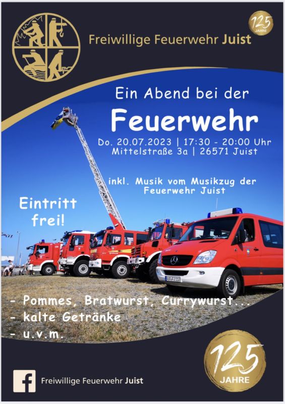 Die Freiwilllige Feuerwehr führt am Donnerstag, den 20. Juli, ab 17:30 Uhr einen "Abend bei der Feuerwehr" durch. Für das leibliche Wohl wird gesorgt, es können unter anderem die Fahrzeuge besichtigt werden, ebenso wird es ein Konzert mit dem Musikzug der Freiwilligen Feuerwehr Juist geben. Der Eintritt ist frei.