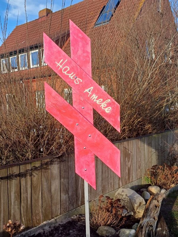 Foto Nr. 5: Dieses „Bauwerk“ findet bei den Anwohnern der Siedlung teilweise wenig Anklang und wird von diesen bemängelt. Das Haus-Namensschild des Ferienhauses „Ameke“ (früher Lehniger und Lehniger-Barels) erscheint ihnen zu groß und steche durch die grelle Warnfarbe zu sehr ins Auge. Das Zeichen selbst wurde in seiner Gestaltung den Hinweisen auf Strandaufgänge angelehnt.