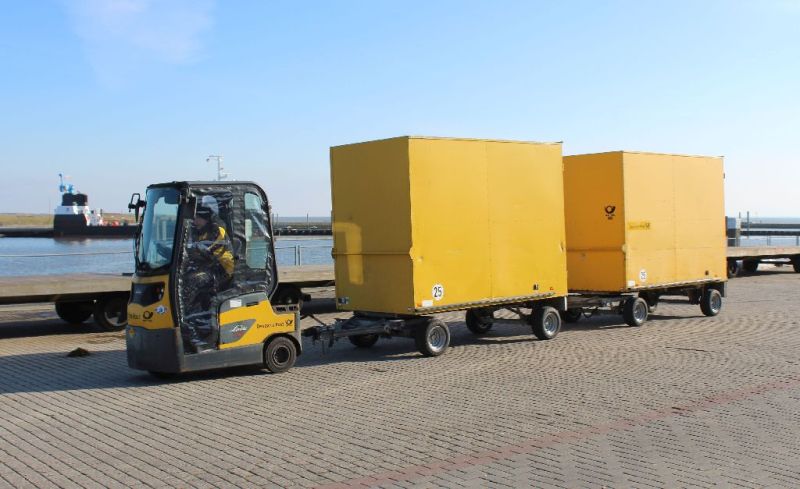 So geht die Post für Juist nicht mehr den jahrzehntelangen Weg, wobei in Norddeich die Postcontainer – dass sind kleine Anhänger – angeliefert, verladen und per Personenfähre zur Insel befördert wurden. Beim Umschlag im Norddeicher Hafen kam es zu zwei Unfällen, wobei es sich nicht um Bagatellen, sondern um sehr ernst zu nehmende Verletzungen von Umschlagmitarbeitern handelte. Daher kam der Wunsch der Post, die Zustellung sicherer zu machen und in bewährte Speditionshände zu geben. Jetzt wird die Post in einem LKW-Anhänger in Norddeich angeliefert, dieser wird per Frachtschiff nach Juist gebracht, dort wird die Post entladen und in die Postanhänger umgeladen, die jetzt nur noch zwischen Hafen und der Verteilerstation (Altes Postamt in der Friesenstraße) verkehren.