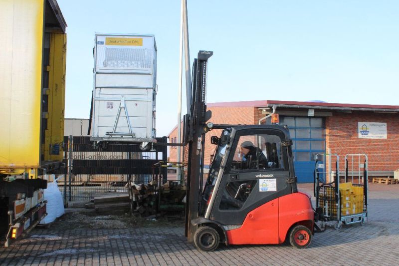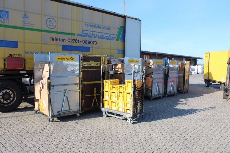 Die Post gehört somit zu den übrigen Frachten und ist also erst mit etwas Verzögerung an der Reihe. Mittels Gabelstapler werden die Rollis aus dem Janssen-Hänger geholt und in die Postanhänger umgeladen. Dabei ist vorsichtiges Handeln vonnöten, die die heutigen Anhänger sind sehr viel höher und können bei unsachgemäßer Handhabung (z.B. zu starkes Einschlagen der Deichsel/Vorderräder) leicht kippen. Aber die Mitarbeiter Tomek Meger und Waldek Zieminski machen das inzwischen mit großer Routine. Nach Beladung der Postwagen erhalten die Postmitarbeiter eine Whatsapp-Nachricht, dass die Wagen abholbereit sind. Die Umladung am Hafen passiert bei jedem Wetter, ergänzt Solveig Schmitz von der Hafenlogistik. Bei Regen nicht immer optimal, denn die Rollis mit der Paketpost sind nach vorne und oben offen.