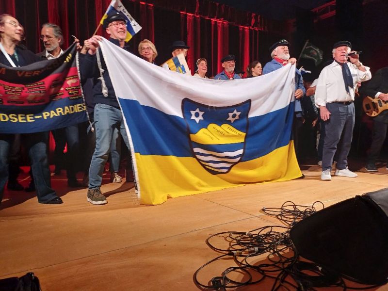 Am Ende der Veranstaltung übergaben Florian Fock als Leiter der veranstaltenden Hermann-Lietz-Schule und Heilwig Brings gemeinsam mit dem großen Orga-Team die Veranstalterflagge des traditionsreichen Festes an das neue Orga-Team des Heimatverein Juist. Damit kehrt die Flagge nach neun Jahren wieder an ihren Ursprungsort zurück. Sie wurde in Empfang genommen von der Heimatvereinsvorsitzenden Sylvia Hupens und ihrem Stellvertreter Jens Heyken, der in diesem Jahr auch die Vertretung für seinen Vater übernehmen musste. Hans Heyken hatte vor 29 Jahren die Idee zu diesem Treffen, erstmalig war er diesmal nicht dabei. Nach der Flaggenübergabe – auch das ist Tradition – stand der ganze Saal und sang die Insel-Nationalhymne „Die Sieben zum Verlieben“ und dann – ja, wieder After-Show-Party in der „Kogge“.