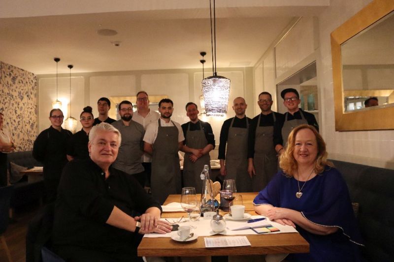 Die dritte Aufnahme zeigt vorne Guido Fritz und Sylvia Paul, dahinter die beiden Küchenteams, die an dem Abend gekocht hatten.